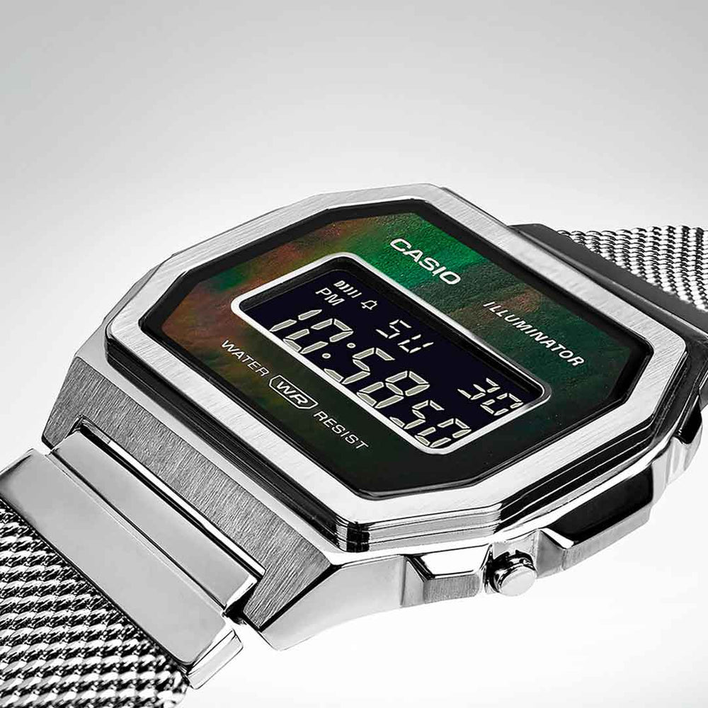 Die CASIO Vintage A1000 Premium Modelle sind Design-Ikonen aus besonders hochwertigen Materialien. Das Gehäuse besteht aus massivem Edelstahl – in klassischem Silber oder Gold-Farbnuancen. Die aufwendige Beschichtung durch Ionisierung sorgt für langlebige Farben und schützt vor Absplittern. Zifferblätter in farblich abgestimmtem, edlem Perlmuttlook verleihen den Uhren eine außergewöhnliche Note.