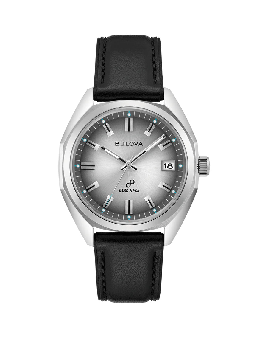 Direkt aus den 1970er Jahren stammt diese Bulova Jet Star „F“, ein ikonisches Modell aus der beeindruckenden Geschichte der Marke, jetzt ausgestattet mit einem ebenso beeindruckenden Uhrwerk. Das Edelstahlgehäuse ist eine Anlehnung an sein historisches Vorbild und zeichnet sich durch ein markantes kantiges Design mit breiten Facetten und einem gewölbten Saphirglas aus. Ein grauer Ziffernring betont das leuchtend silberfarbene Zifferblatt mit Sonnenschliff, die aufgesetzten schwarzen und silbernen Stundenmarkierungen und die Zeiger mit schwarzen Akzenten. Lumineszenzanzeigen bei jeder Stunde und ausgefüllte Zeiger ermöglichen eine hervorragende Lesbarkeit in jeder Umgebung, während eine Datumsanzeige perfekt bei 3 Uhr sitzt. Das Precisionist-Uhrwerk von Bulova treibt den neuen Jet Star an, einen revolutionären 8-Juwelen-Quarzmechanismus, der mit bemerkenswerten 262 kHz vibriert, eine Genauigkeit von 5 Sekunden pro Monat aufweist, eine erhöhte Widerstandsfähigkeit gegenüber Temperaturschwankungen aufweist und über einen schwungvollen Sekundenzeiger verfügt. Ergänzt wird das Edelstahlgehäuse durch ein schwarzes Lederarmband. Präsentieren Sie Ihre Sachen im legendären Stil mit dem hochfliegenden Bulova Jet Star „F“, einem legendären Design, das für den modernen Kenner nachgebildet wurde.