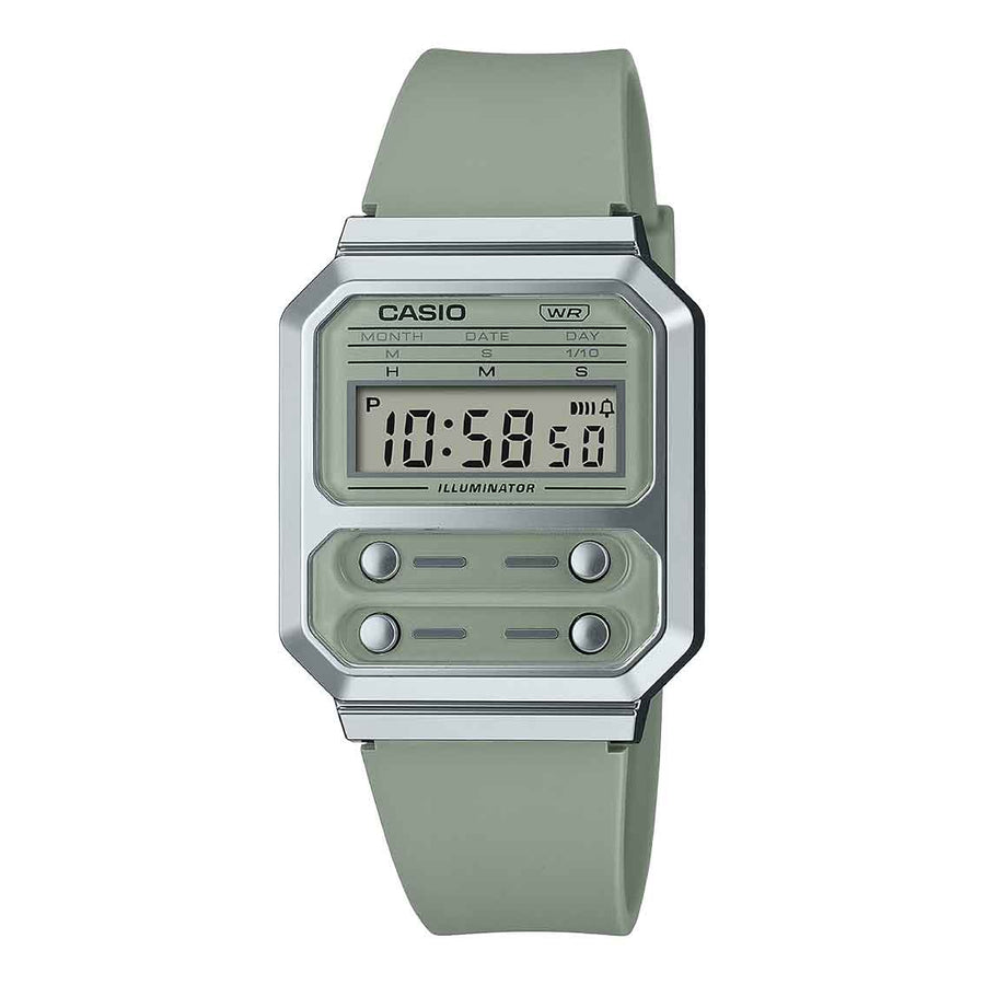 Eine Hommage an die Casio F-100, die erste Casio Uhr mit einem Gehäuse aus Kunstharz, erinnert die neue A-100 Linie an die ikonischen vier Knöpfe auf der Vorderseite und fügt Metallkomponenten im Vintage-Stil hinzu. Dieser Zeitmesser ist zwar Retro im Stil, aber trotzdem modern in der Funktionalität und ausgestattet mit Stoppuhr, Kalender, wasserdichtem Gehäuse für den täglichen Gebrauch und natürlich LED-Leuchten für leichtes Ablesen bei allen Lichtverhältnissen.