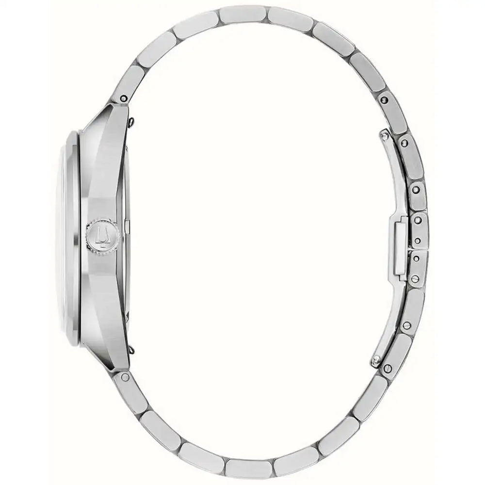 Direkt aus den 1970er Jahren stammt diese Bulova Jet Star „F“, ein ikonisches Modell aus der beeindruckenden Geschichte der Marke, jetzt ausgestattet mit einem ebenso beeindruckenden Uhrwerk. Das Edelstahlgehäuse ist eine Anlehnung an sein historisches Vorbild und zeichnet sich durch ein markantes kantiges Design mit breiten Facetten und einem gewölbten Saphirglas aus. Ein grauer Ziffernring betont das leuchtend silberfarbene Zifferblatt mit Sonnenschliff, die aufgesetzten schwarzen und silbernen Stundenmarkierungen und die Zeiger mit schwarzen Akzenten. Lumineszenzanzeigen bei jeder Stunde und ausgefüllte Zeiger ermöglichen eine hervorragende Lesbarkeit in jeder Umgebung, während eine Datumsanzeige perfekt bei 3 Uhr sitzt. Das Precisionist-Uhrwerk von Bulova treibt den neuen Jet Star an, einen revolutionären 8-Juwelen-Quarzmechanismus, der mit bemerkenswerten 262 kHz vibriert, eine Genauigkeit von 5 Sekunden pro Monat aufweist, eine erhöhte Widerstandsfähigkeit gegenüber Temperaturschwankungen aufweist und über einen schwungvollen Sekundenzeiger verfügt. Ergänzt wird das Edelstahlgehäuse durch ein schwarzes Lederarmband. Präsentieren Sie Ihre Sachen im legendären Stil mit dem hochfliegenden Bulova Jet Star „F“, einem legendären Design, das für den modernen Kenner nachgebildet wurde.