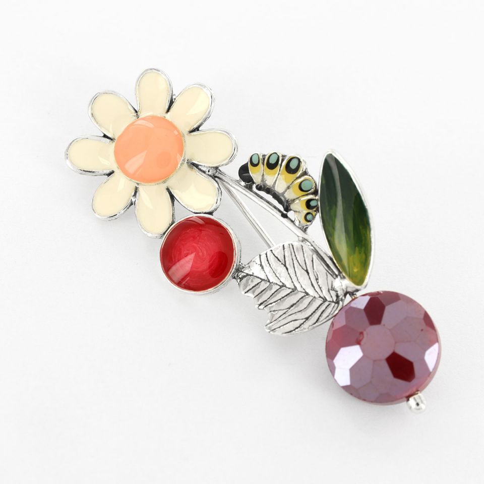 Brosche aus Metall , farbige Harze mit handbemalten Mustern, Glasperlen.