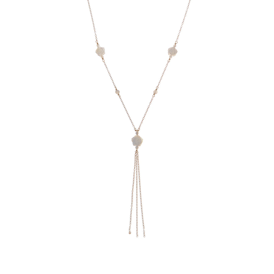 Eine bezaubernde Y-Halskette aus 925er Sterlingsilber, verziert mit drei Perlmuttrosen und zarten Perlen, abgerundet durch feine baumelnde Silberketten für einen Hauch ätherischer Eleganz.