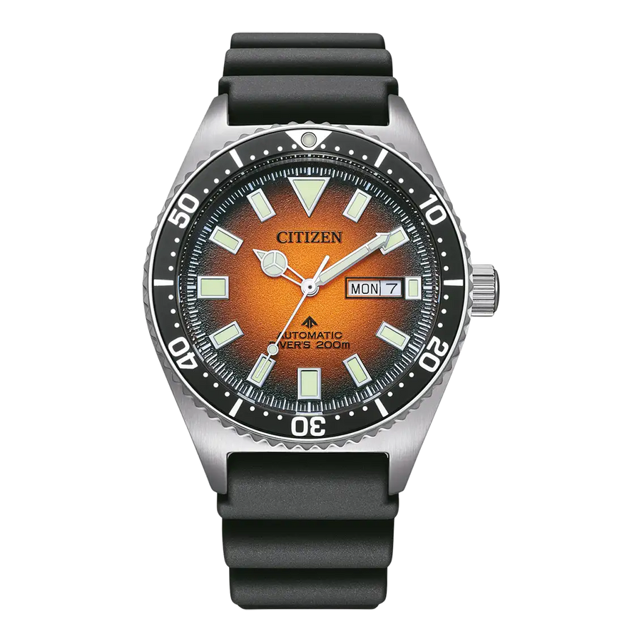 - Ziffernblatt: orange verlaufend, Leuchtmaterial auf Zeige und Indexe