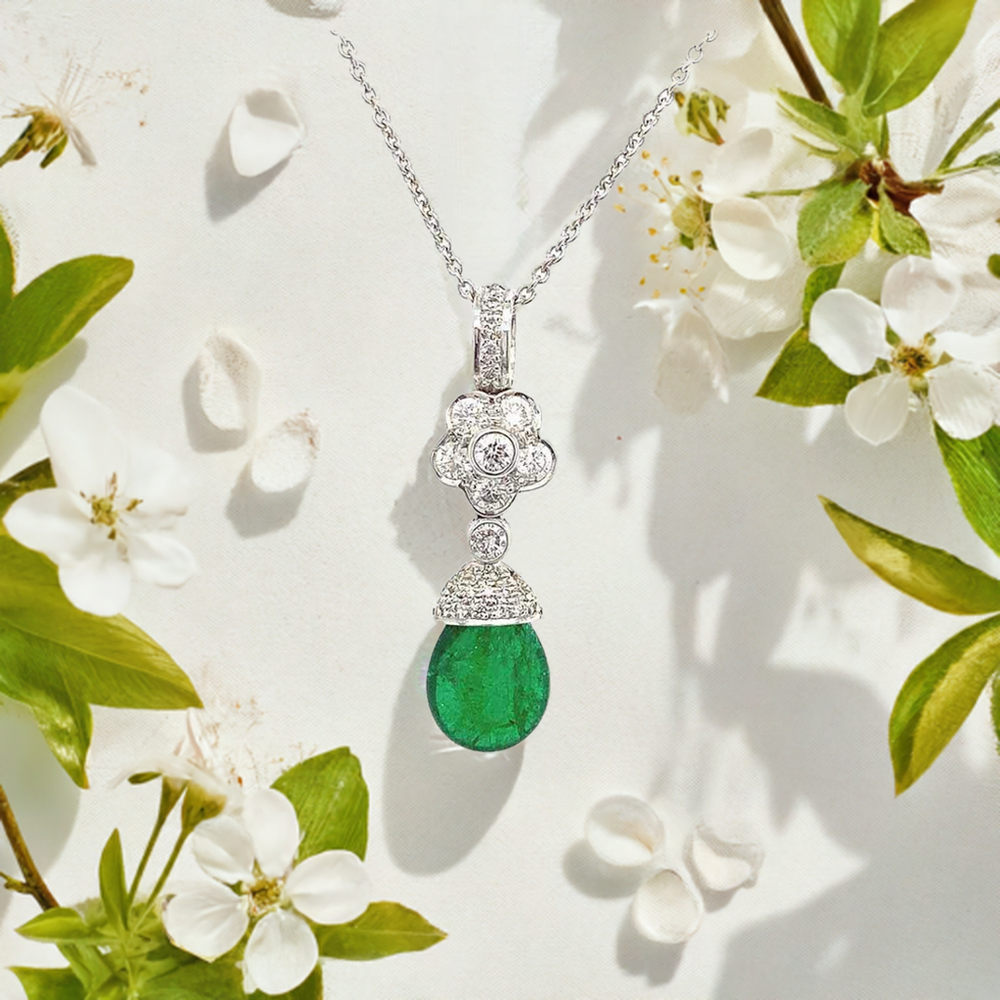 Kette mit Blumen-Anhänger, 750 Weißgold, Smaragde und Brillanten