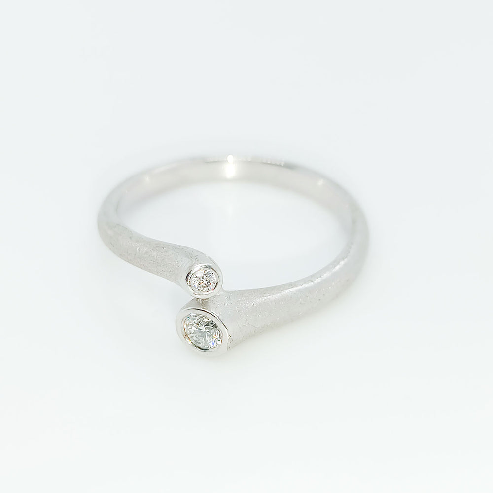 Moderner Verlobungsring aus hochwertigem Platin 950, veredelt durch eine markante eismatte Oberfläche. Zwei fein gefasste Brillanten (gesamt 0,10 ct, W/si) sorgen für dezenten Glanz und ein modernes Erscheinungsbild. Ringgröße 54.
