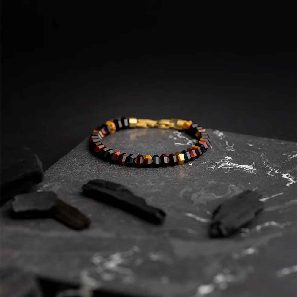 Das Octo 3 Colors Armband von Gemini ist eines der Prunkstücke der Kollektion. Die achteckigen Natursteine für dieses Armband werden von professionellen Handwerkern von Hand bearbeitet. Das Armband ist mit Titan, Stahl und einer 18-karätigen Vergoldung versehen. Die verschiedenen Elemente gehen nahtlos ineinander über und machen dieses Armband zu einem weltweit einzigartigen Armband. Dieses Armband besteht aus Tigerauge-Steinen, die oft als Kriegerstein bezeichnet werden. Es ist ein kraftvoller Stein, der Sie vor negativen äußeren Einflüssen schützt. Außerdem soll es Mut, Kraft und Ausdauer steigern. Länge 20-21 cm