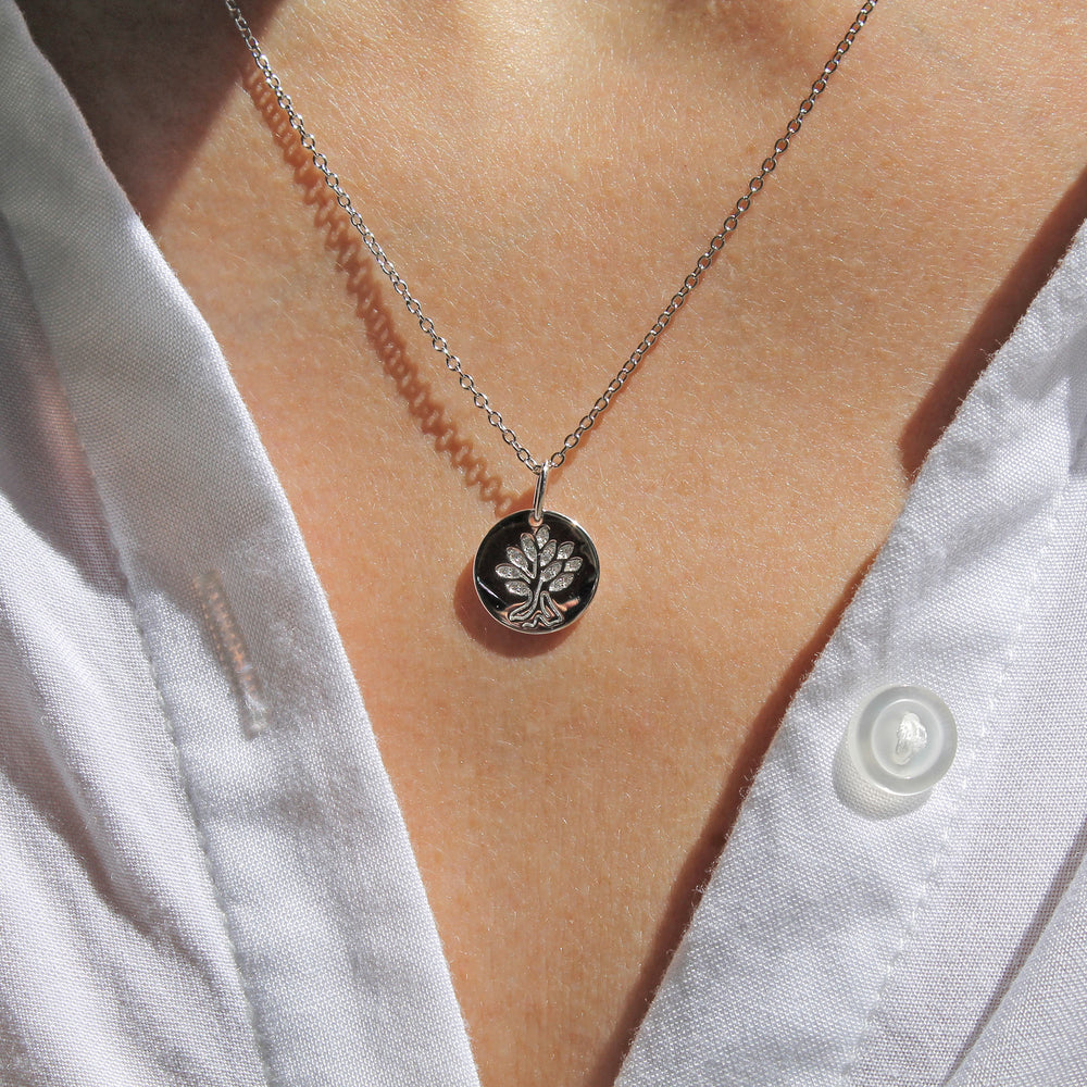Der Baum des Lebens; ein Symbol mit vielen Bedeutungen. Doch egal was er für dich repräsentiert – der Baum des Lebens unserer DanilaNor Serie lässt dich genau das auf eine elegante und einfache Weise ausdrücken. Das Schmuckstück besteht aus einem runden, rhodinierten Silber Plättchen, mit 12 mm Durchmesser, auf welchem der Baum des Lebens eingraviert ist. Dies lässt die Halskette leicht und schlicht wirken, während die mit kubisch Zirkoniasteinen besetzten Blätter einen Touch von Eleganz verleihen. Die beiliegende rhodinierte Silber Halskette misst 42 cm, plus weitere 3 cm zur Justierung der Länge.
