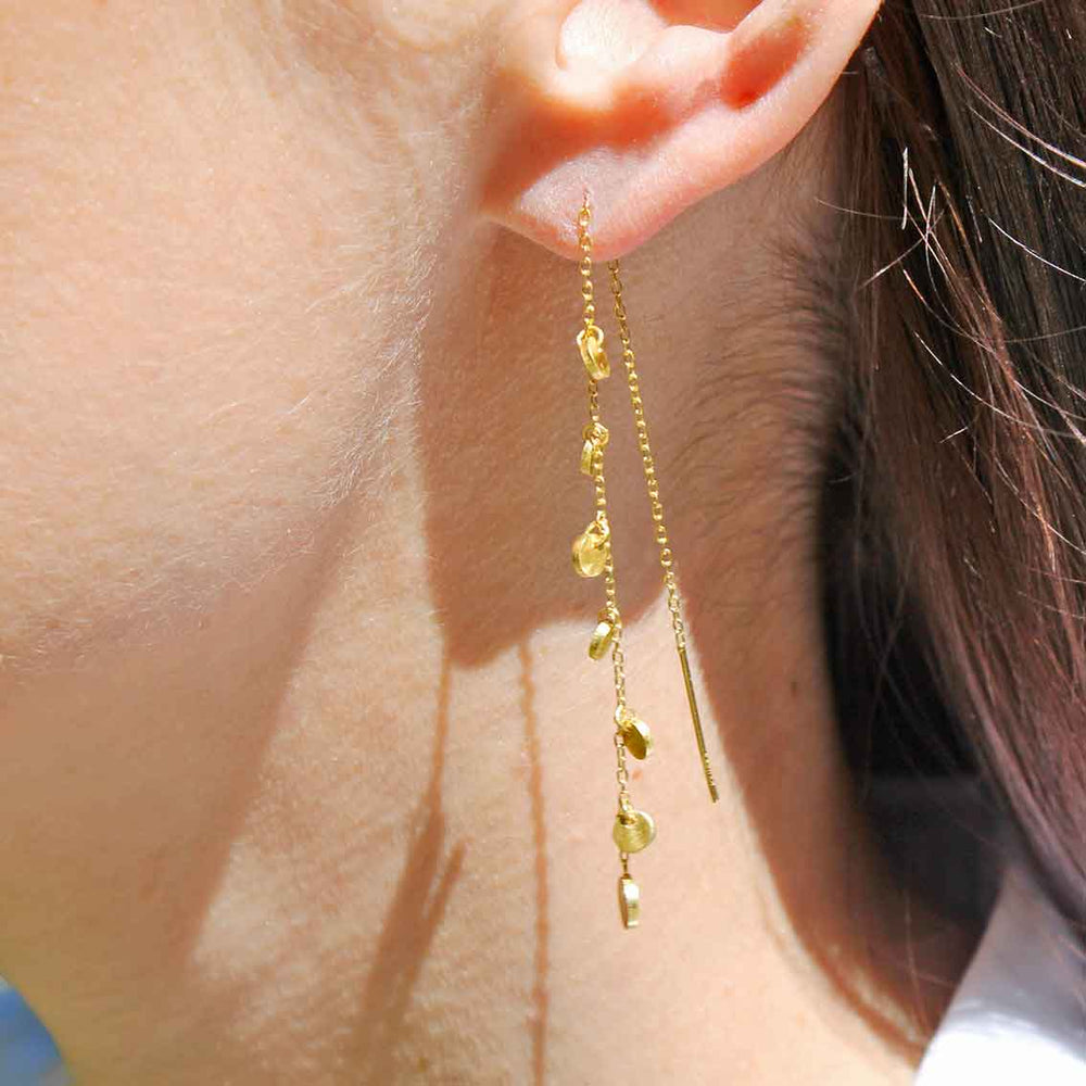 Die gesamte Länge der Ohrhänger beträgt 13 cm. Der Teil mit den zwei Kreisplättchen misst 6 cm.