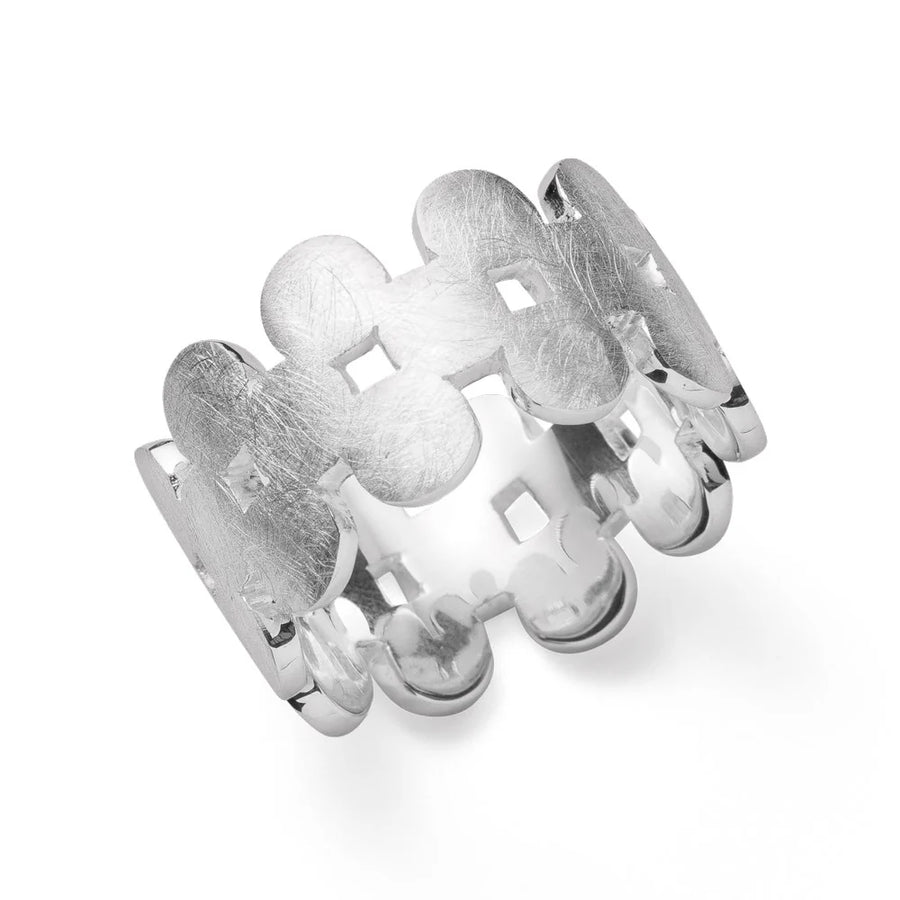 Trotz seiner markanten Erscheinung ist dieser Ring erstaunlich vielseitig. Die kratzmattierte Oberfläche verleiht ihm eine zurückhaltende Eleganz, während die geometrische Formgebung für moderne Ausdruckskraft sorgt. Das Ergebnis: ein Ring, der sowohl im Büro als auch beim Dinner eine gute Figur macht.