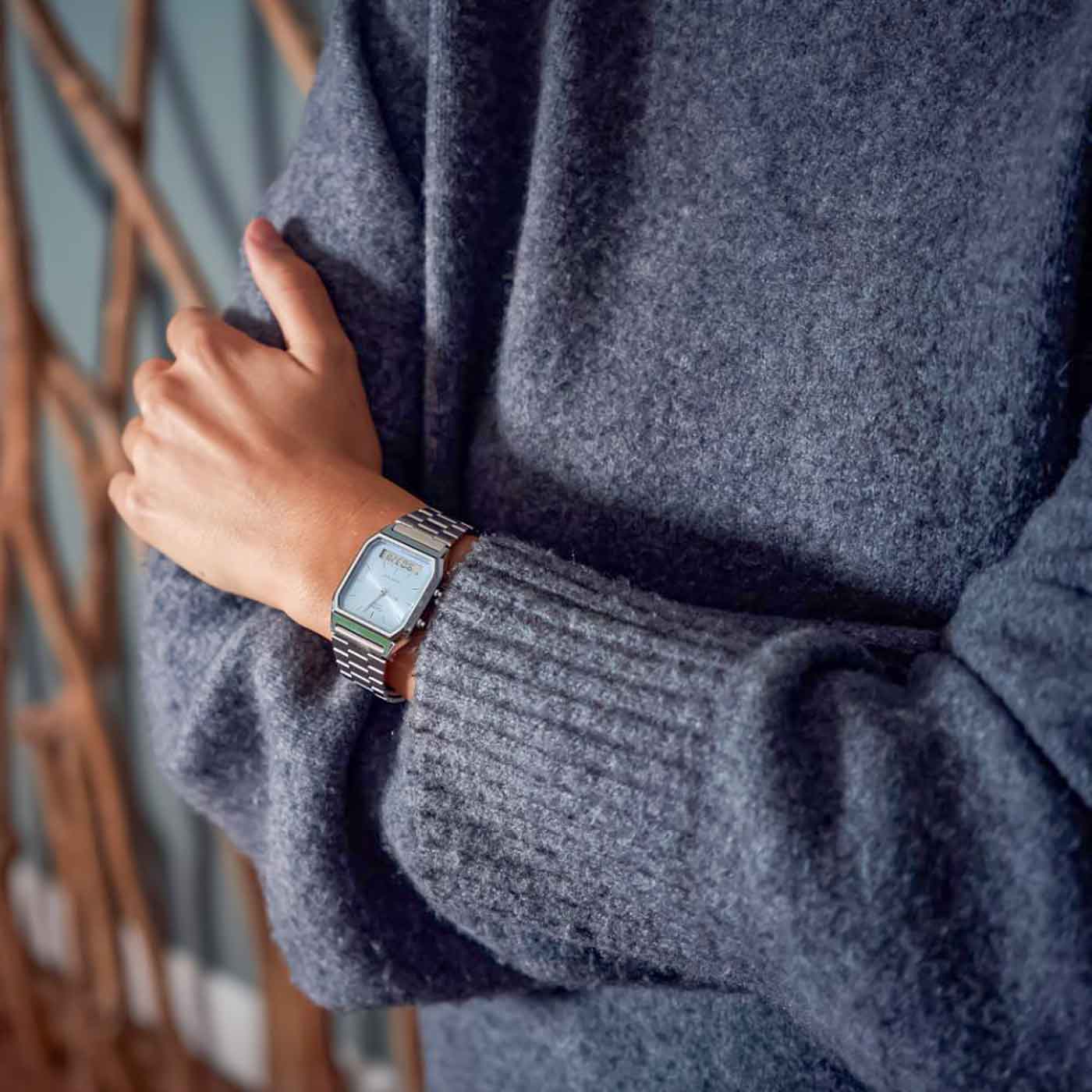 Charmant klassisch, trendig bunt. Das eckige Gehäuse umrahmt ein Zifferblatt, das den neuesten Farbtrends folgt. Retro-Einfachheit trifft auf moderne Funktionalität in einer analogen Uhr mit kleinem digitalen Fenster für nützliche Infos auf Knopfdruck. Ein vielseitiges, elegantes Design für jeden Anlass, von formellen Veranstaltungen bis hin zu legeren Treffen.