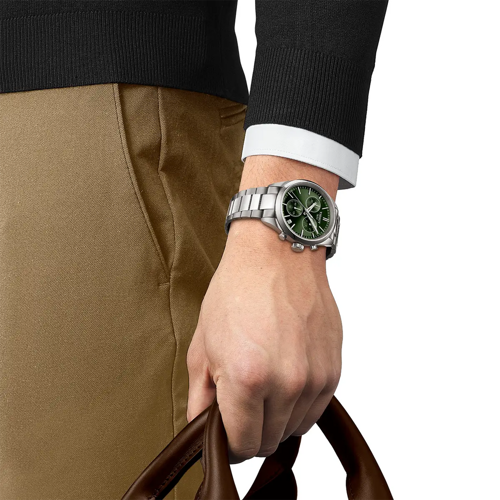 Dieses Tissot PR 100 Chronograph Modell verfügt über ein 40 Millimeter messendes 316L-Edelstahlgehäuse und ein präzises Swiss Made Quarzwerk mit Endanzeige der Batterielebensdauer. Sein dunkelgrünes Zifferblatt mit Stabindizes und Datumsanzeige liegt gut geschützt unter kratzfestem Saphirglas.