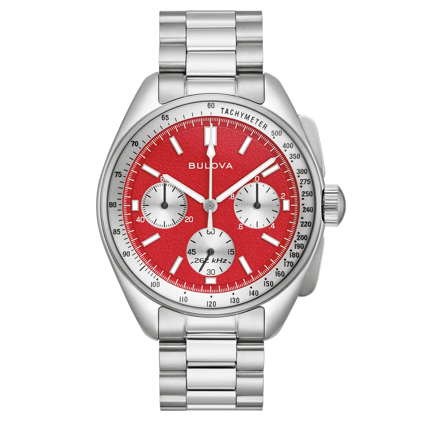 Das einzigartige rot-silberne Zifferblatt im "Panda"-Stil ist eine Hommage an den "Blutmond" – die rote Färbung des Mondes während einer totalen Mondfinsternis. Der silber-weiße Tachymeterring und das Retro-Bulova-Logo mit Stimmgabel unterstreichen den vintage-inspirierten Charakter. Leuchtende Zeiger und Indexe garantieren optimale Ablesbarkeit auch bei Dunkelheit.