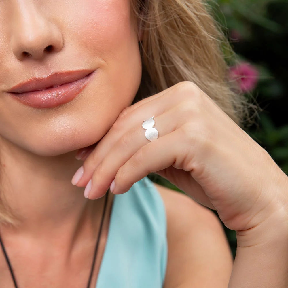 Die runden Schmuckelemente (je 0,8 cm Durchmesser) fügen sich harmonisch zusammen und schaffen eine dreidimensionale Struktur mit Tiefe und Bewegung. Die kratzmattierte Oberfläche verleiht dem Ring eine zurückhaltende Eleganz, während die geschwungene Formgebung für feminine Ausdruckskraft sorgt.