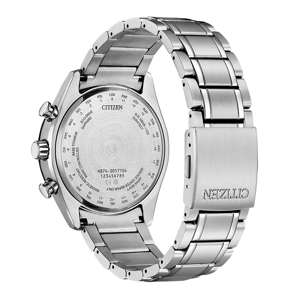 • Kaliberfunktion:  Mondphase, Weltzeit, Funkuhr - EUR - JPY - USA - China, +/- 15 Sek. pro Monat, 180 Tage, Stoß-Erkennungsfunktion