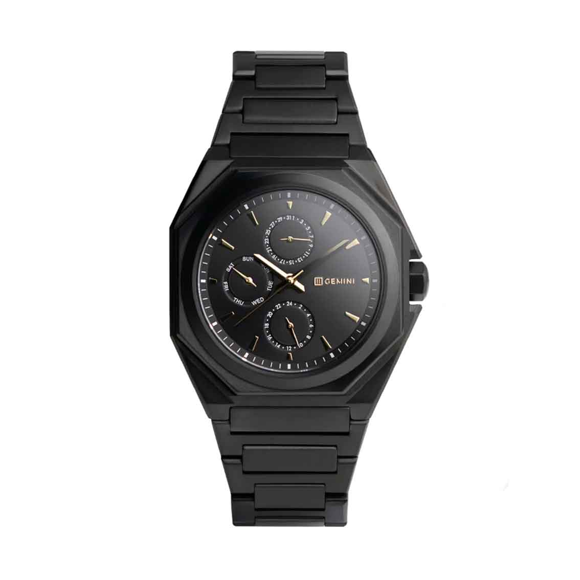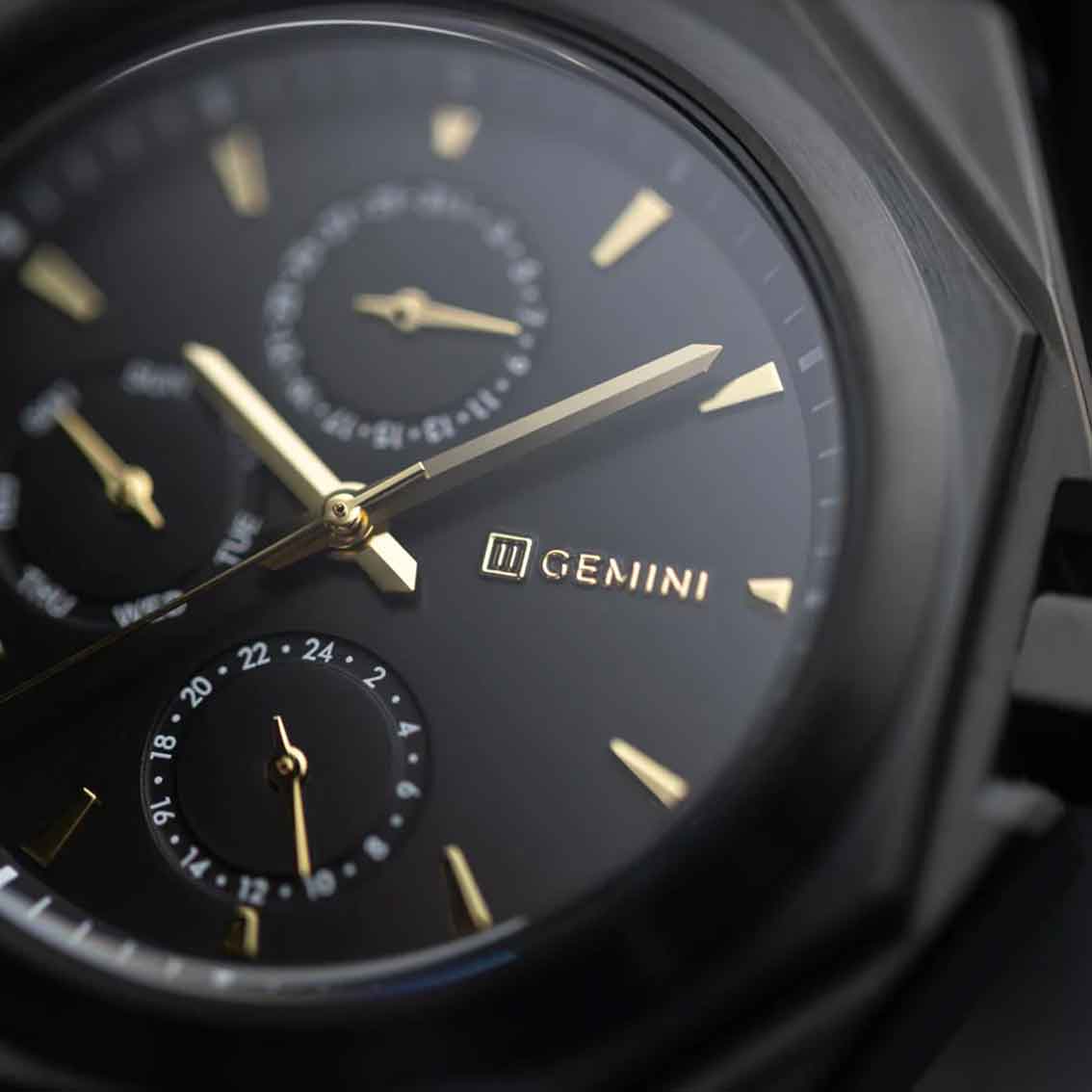 Diese Uhrenserie von Gemini besteht aus Modellen mit Gehäuse und Armband aus Edelstahl 316L. Die achteckige Form wird mit runden Elementen kombiniert, um eine schöne Tiefe zu erzeugen. Die goldenen Elemente schaffen einen markanten Akzent zu den tiefschwarzen Elementen und runden und achteckigen Formen. Das schwarze Stahlarmband und das Gehäuse wurden gebürstet, wodurch ein luxuriöser Look entsteht. Im Inneren schlägt ein japanisches Miyota-Interieur in höchster Qualität.