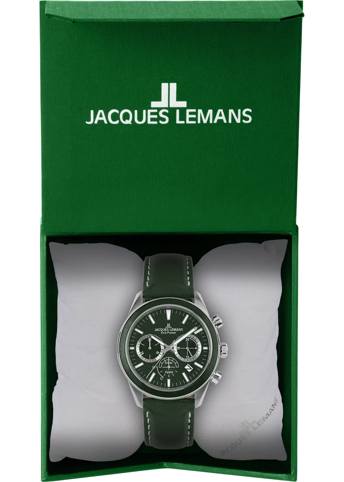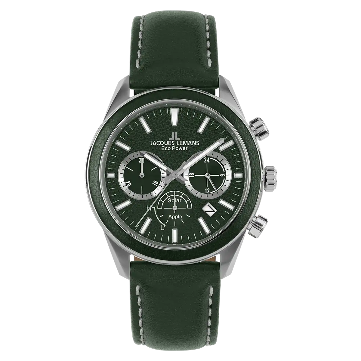 Die Jacques Lemans Eco Power 1-2115D vereint umweltfreundliche Solar-Technologie mit innovativem AppleSkin-Armband. Das edle Edelstahlgehäuse mit markant grünem Zifferblatt macht diese Herrenuhr zum perfekten Begleiter für umweltbewusste Männer mit Stil.