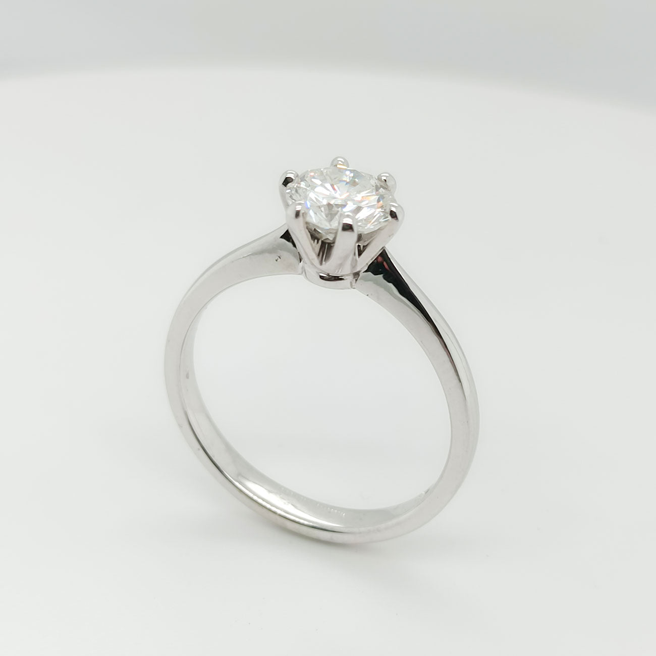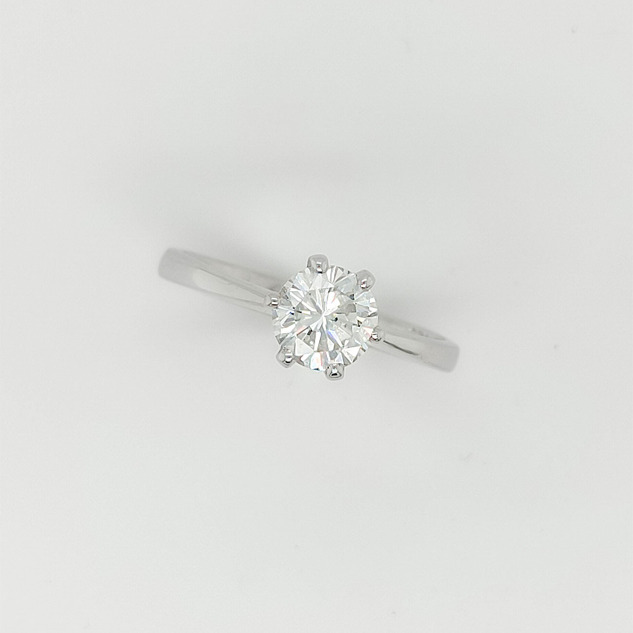 Dieser exquisite Solitär-Ring aus hochwertigem 750 Weißgold (18 Karat) ist ein Meisterwerk der Goldschmiedekunst. Der funkelnde Brillant von 0,85 ct überzeugt mit der Farbe TW (Top Wesselton) sowie der Reinheit VVS (Very Very Small Inclusions) – ein Diamant von außergewöhnlicher Qualität und Brillanz, der jeden Moment zum Strahlen bringt.