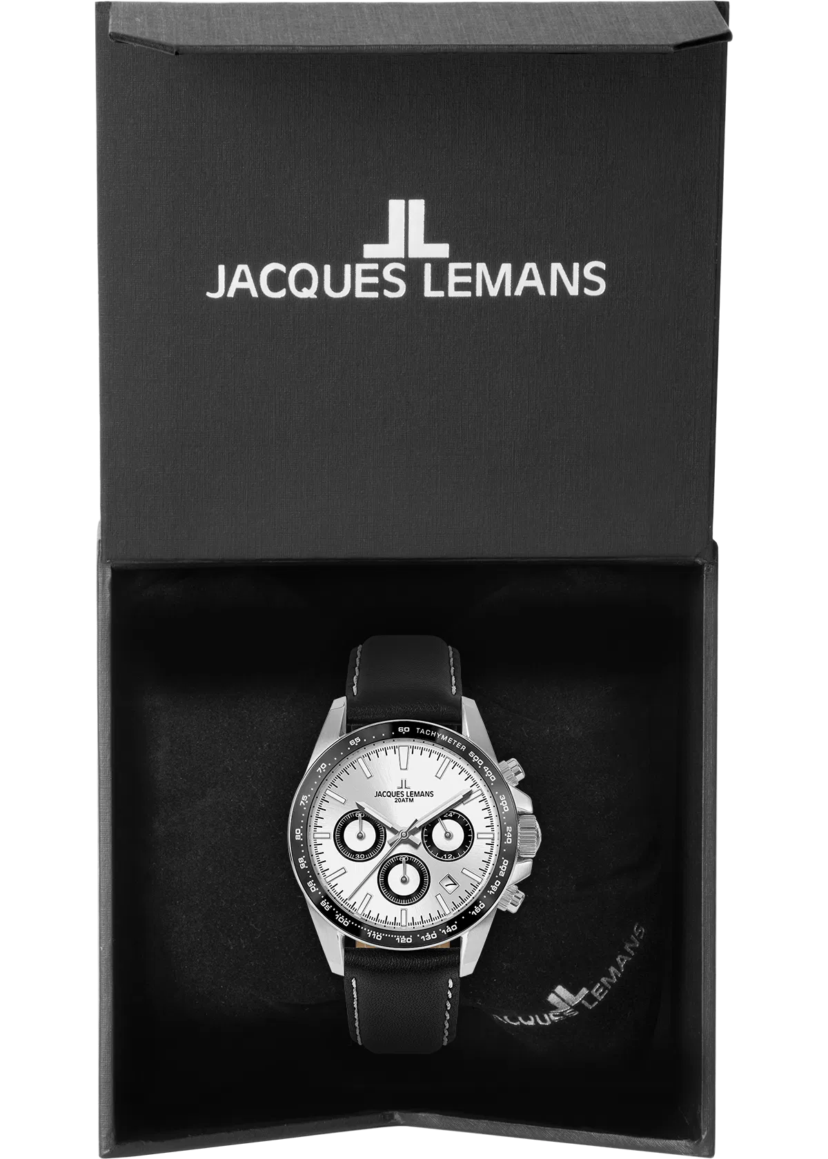 Der Jacques Lemans Liverpool 1-1877B Chronograph vereint sportliches Design mit präziser Zeitmessung. Das robuste Edelstahlgehäuse kombiniert mit einem hochwertigen Lederarmband macht diese Herrenuhr zum perfekten Begleiter für aktive Männer mit Stil.